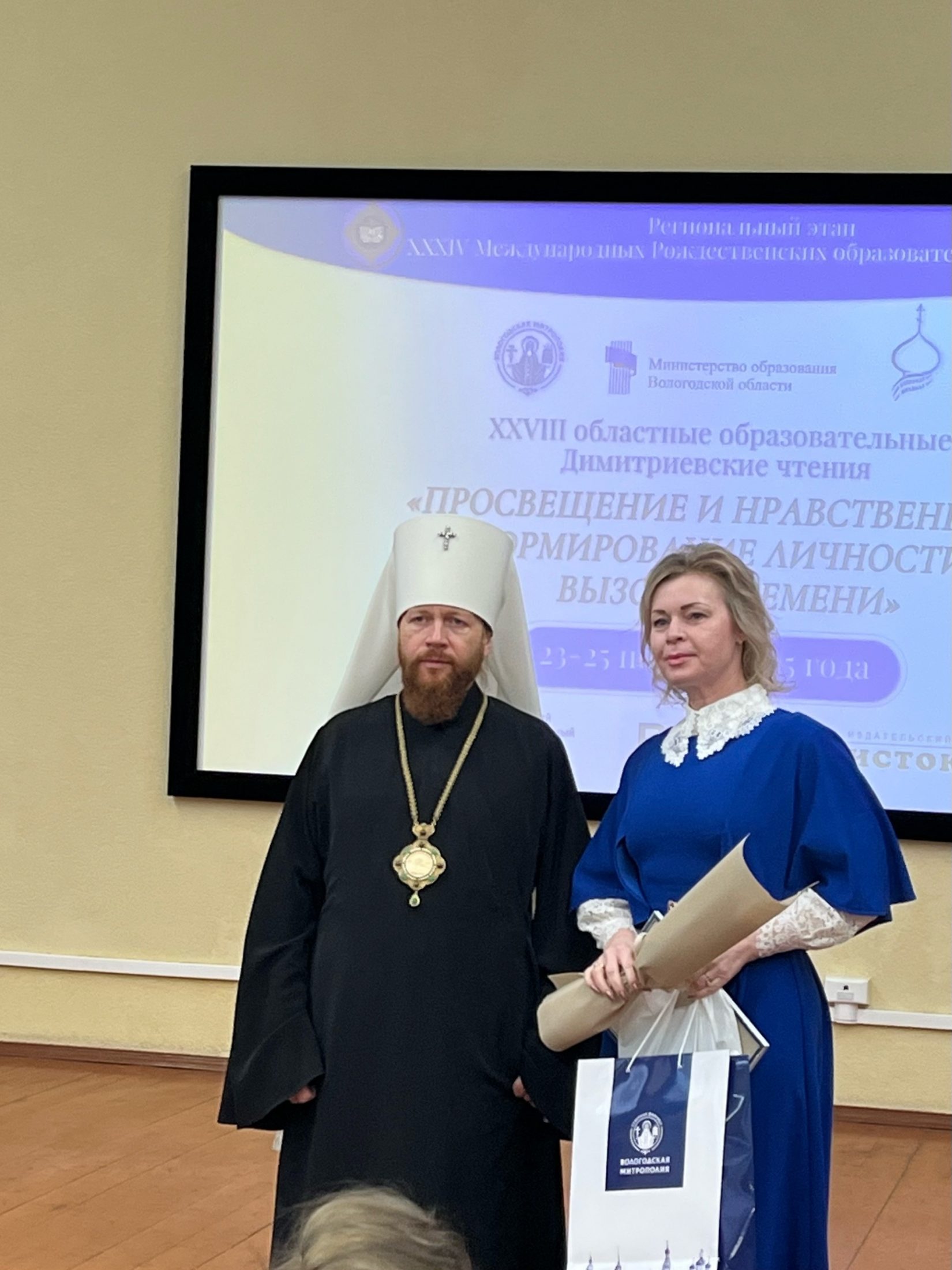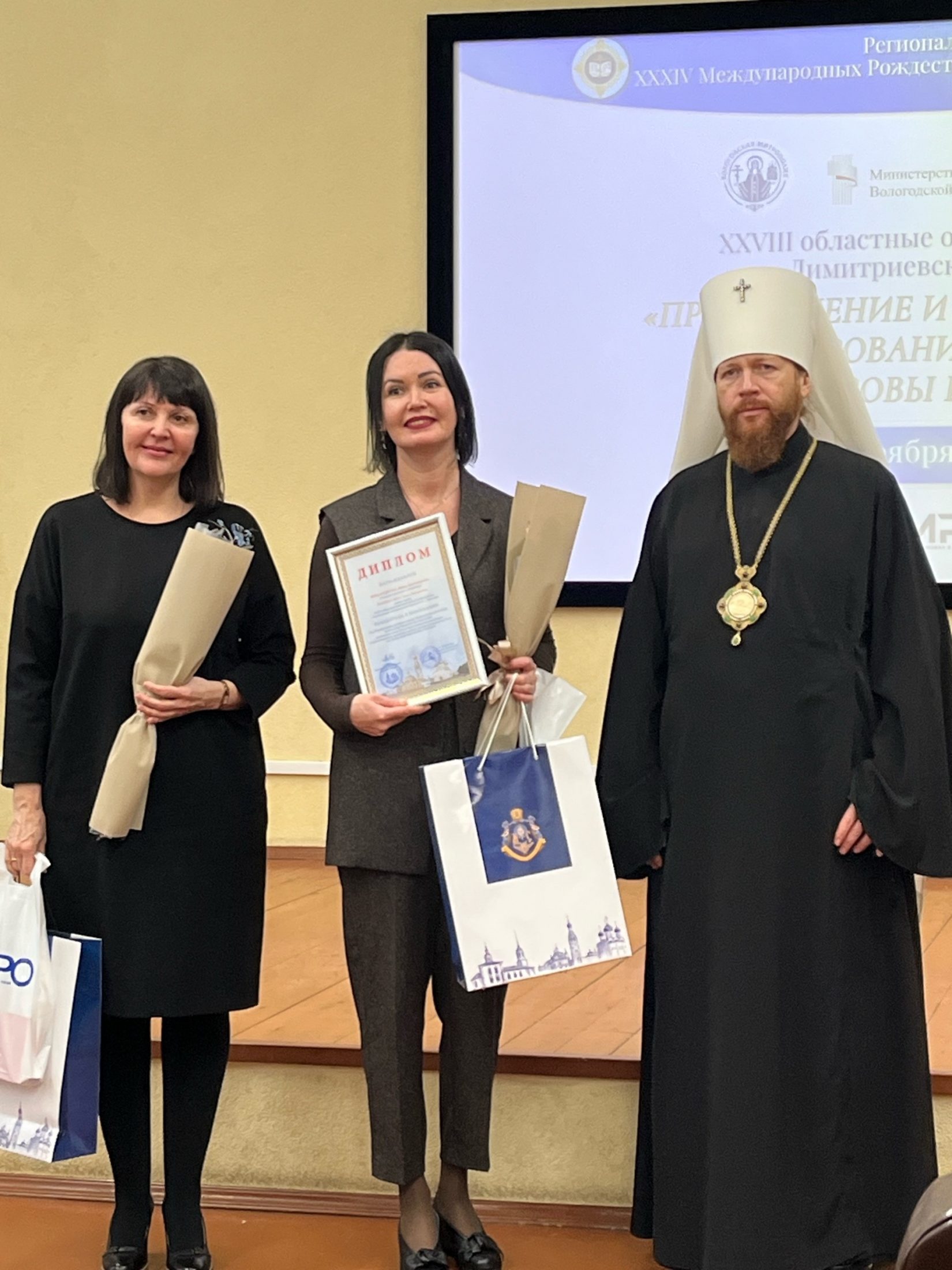 На пленарном заседании состоялось награждение победителей регионального этапа XX ежегодного Всероссийского конкурса в области педагогики, воспитания и работы с детьми и молодёжью до 20 лет «За нравственный подвиг учителя», среди которых педагогические работники образовательных учреждений Череповецкой епархии: Татьяна Сергун, учитель истории и обществознания МАОУ «СОШ № 4» города Череповца; Ирина Никандрова и Ольга Наквасина, учителя МАОУ «СОШ № 35» города Череповца. Поощрительными призами были отмечены Елена Козлова, учитель истории и обществознания, ОРКСЭ и ОДНКНР МБОУ «Санинская основная общеобразовательная школа» деревни Санинская Бабаевского муниципального округа; Виктория Вересова, Надежда Бойцова и Ольга Платонова, сотрудники МДОУ «Детский сад «Теремок» города Устюжны; Елена Соловьева, доцент кафедры отечественной филологии и прикладных коммуникаций Череповецкого государственного университета.