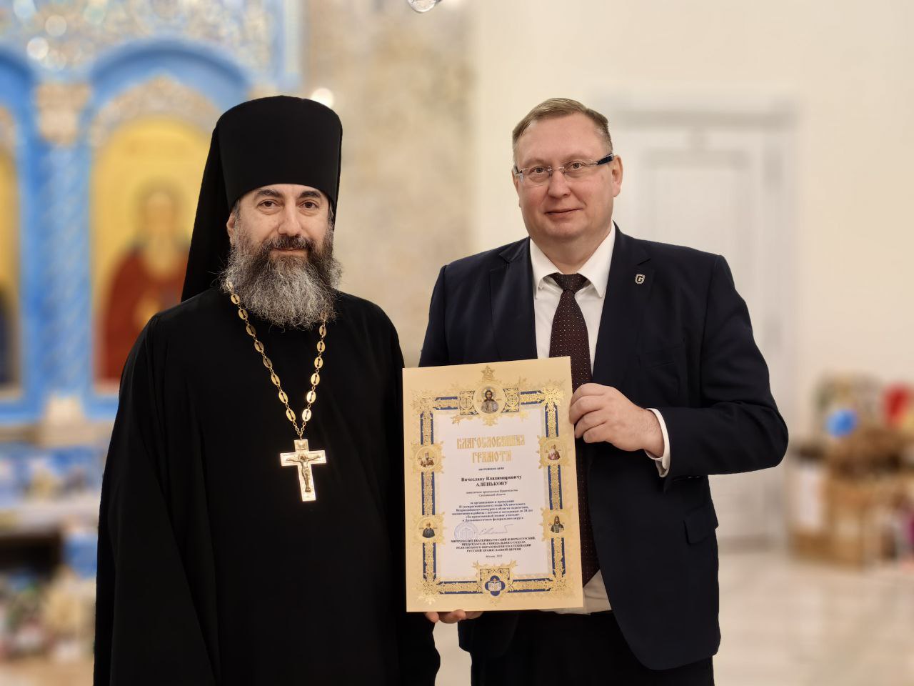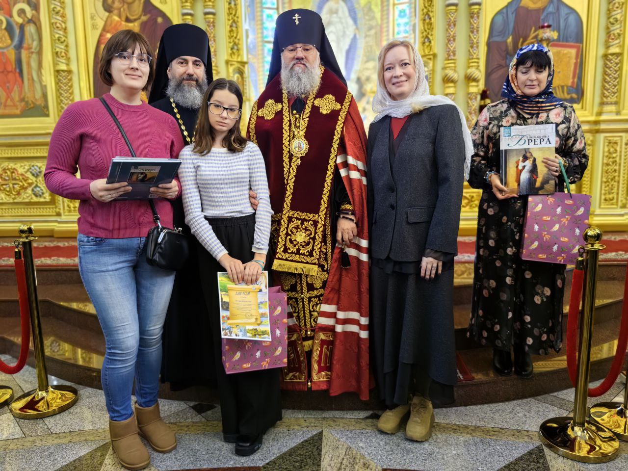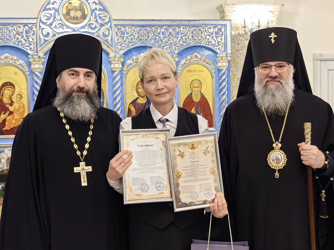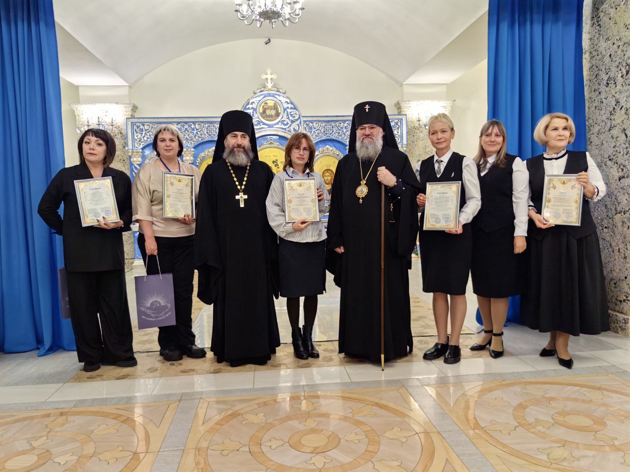 По завершении молебна архипастырь вместе с министром образования и заместителем министра культуры и архивного дела наградили победителей и призеров Всероссийского конкурса «Красота Божьего мира», а также епархиального конкурса сочинений.